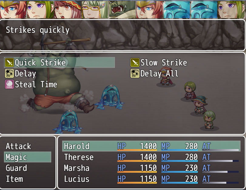 Active Time Battle, um dos sistemas mais utilizados em JRPGs - incluindo a maioria dos Final Fantasy, os Grandia, Chrono Trigger, entre diversos outros. Ao invés dos turnos "rigidos" do RPG Maker, onde cada personagem/inimigo tem sua ação, a batalha passa a ter uma forma mais fluida, cada personagem age de acordo com sua velocidade. Um personagem mais rápido pode, ao longo da batalha, acabar agindo mais vezes do que um personagem mais lento. Habilidades podem interagir com esse sistema, atrasando ou acelerando personagens, demorando mais ou menos para serem utilizadas, etc.